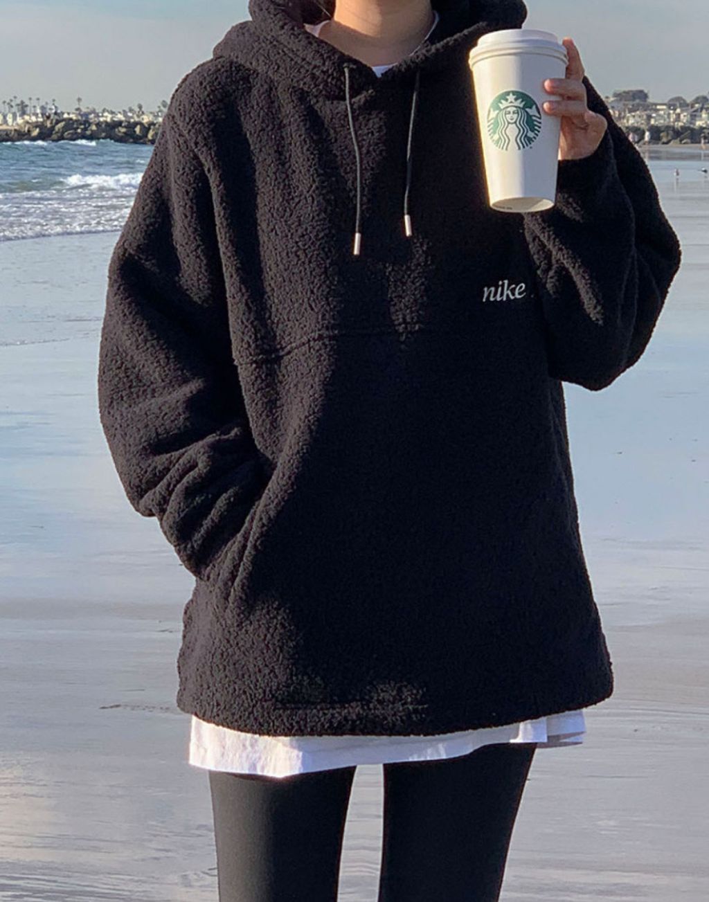 小編冬天超愛這種蓬鬆長版帽Tee,穿起來又軟又暖,正面還有袋鼠口袋,正背面的logo刺繡設計也是很低調有型,黑色款推薦給大家~